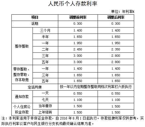 人民币存款利率调整(2016年8月1日起执行)