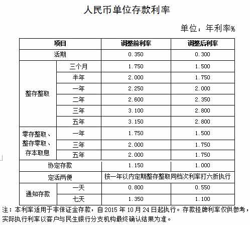 人民币存款利率调整(2015年10月24日起执行)