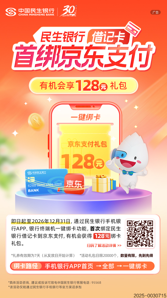 民生银行借记卡首绑京东支付有机会享128元礼包
