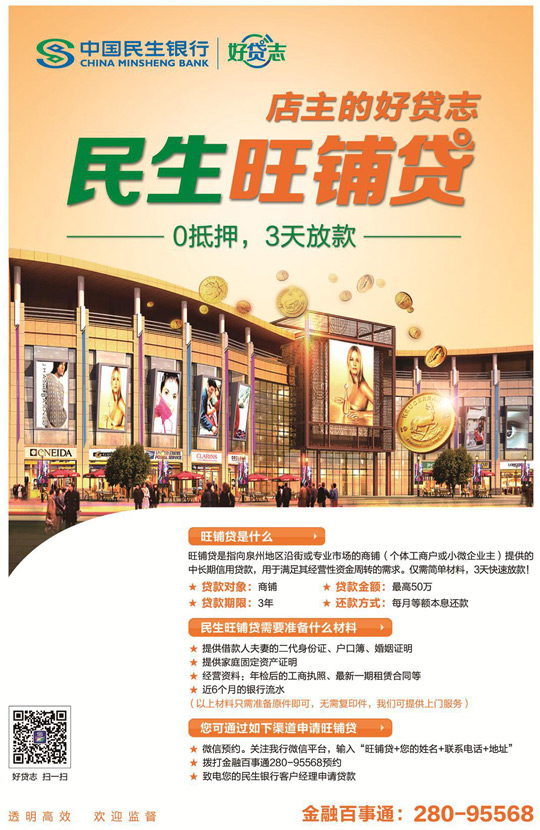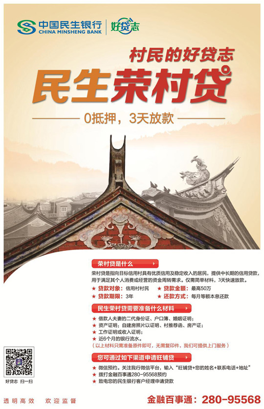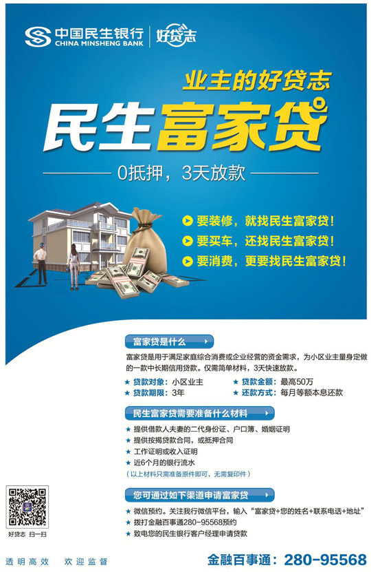 民生银行全新推出房贷通,成功办理,即可加“送”一笔富家贷! 2天批复,短信通知;5年循环,按日计息。